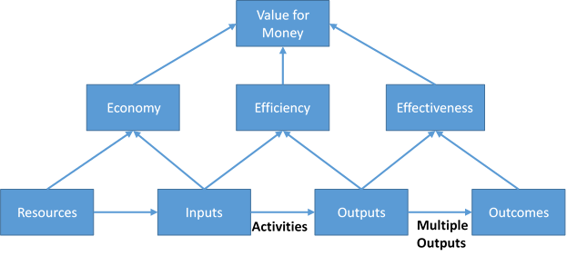 Understand the distinction between outputs and outcomes is a key aspect in determining value for money. This model demonstrates the linkages between inputs, outputs and outcomes and how they contribute to the 3 E’s of value for money.
